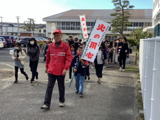 11月5日(水)の午後、大形地区の防火イベントが行われました。火災予防週間に毎年恒例で行っているものです。小学4年生の有志、地域の方々で拍子木に合わせて「火の用心」(カチカチ)を連呼しながら行進しました。この呼びかけで地域の方々が少しでも火災予防に気を付けていただけると嬉しいです。同時に私たち教職員も含め、子どもたちとともに火災予防やいざというときの行動を考えていきたいと思います。